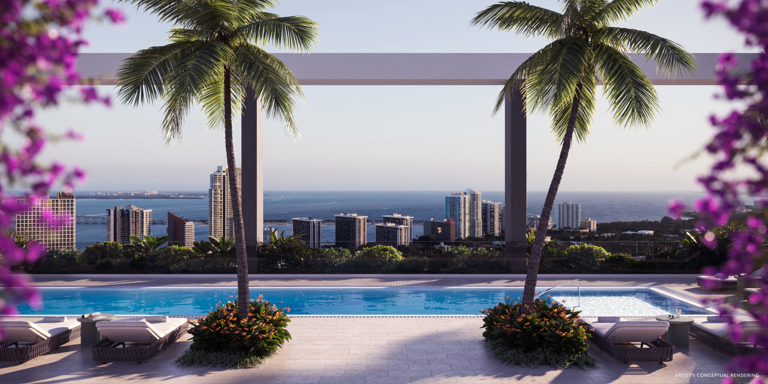 Piscina panorámica con vista a la bahía, espacios de coworking y salas de reuniones, creando un balance perfecto entre relajación y eficiencia en el corazón de Brickell.